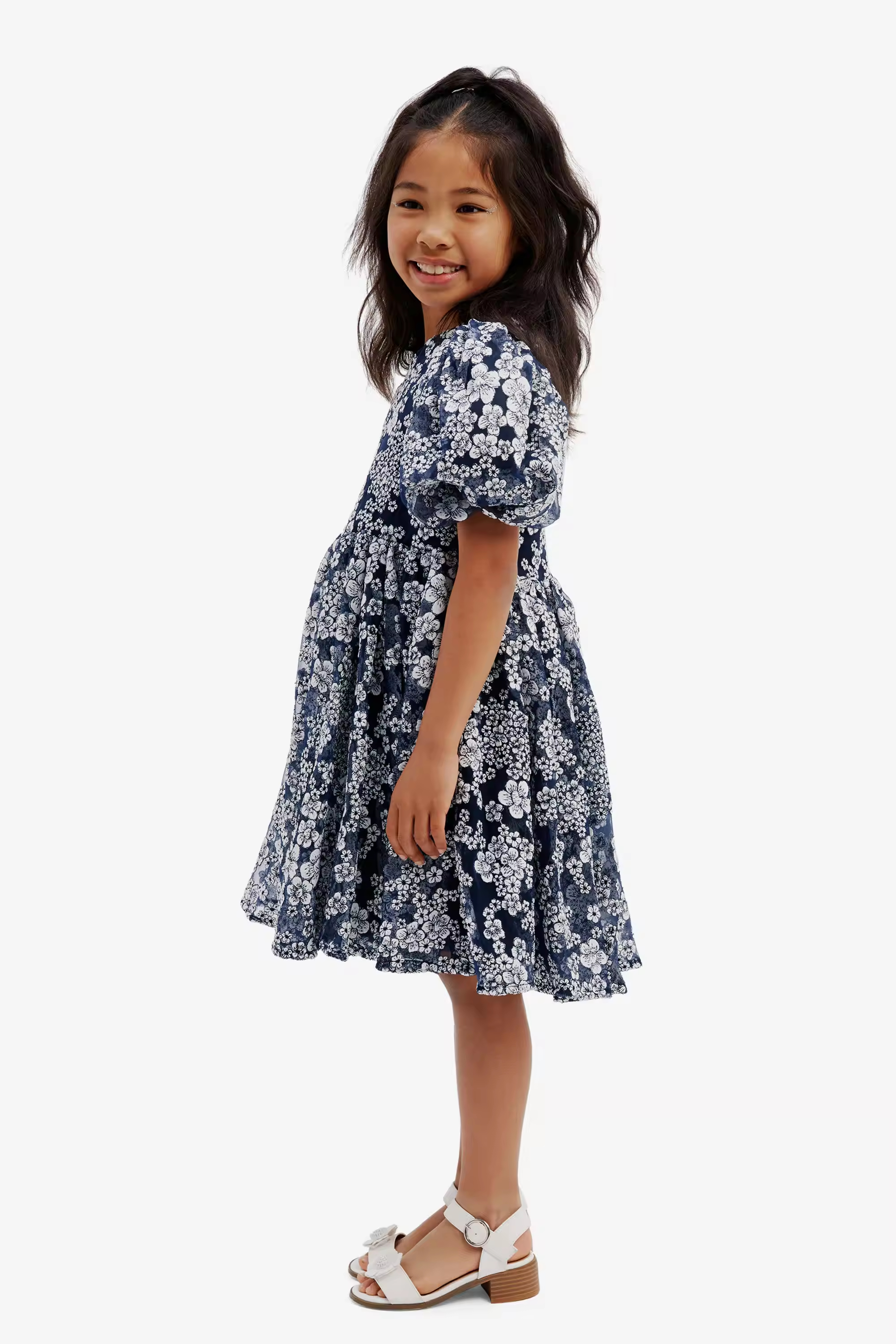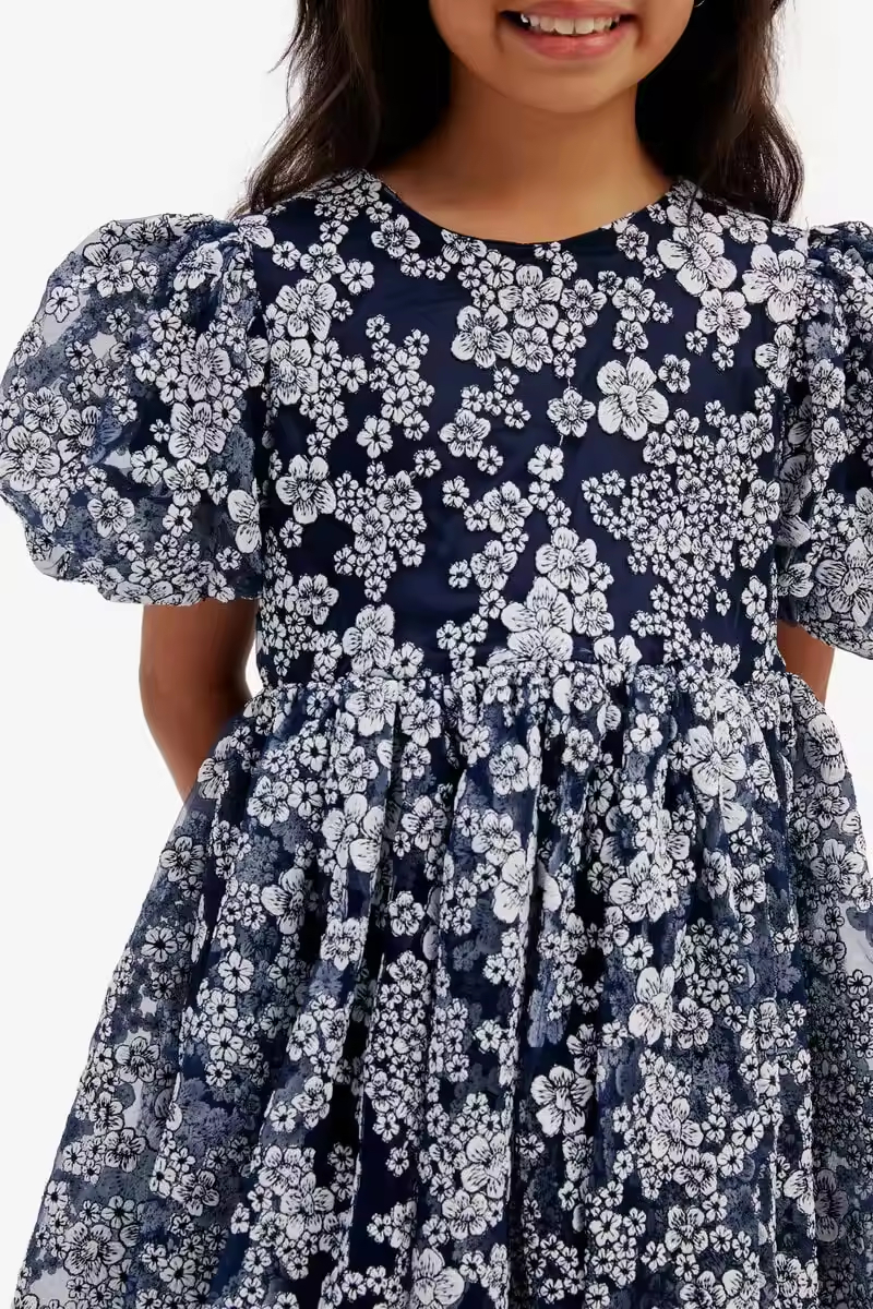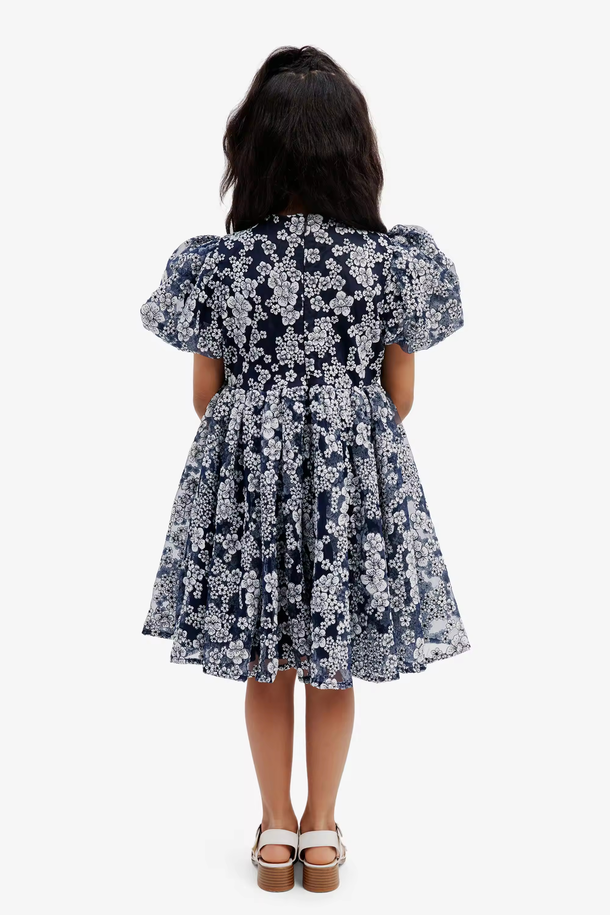 Private Label Navy Blue Floral Cotton Dress for Girls and Kids Woven A-Line Short Sleeve O-Neck Dress With Puffy Sleeves