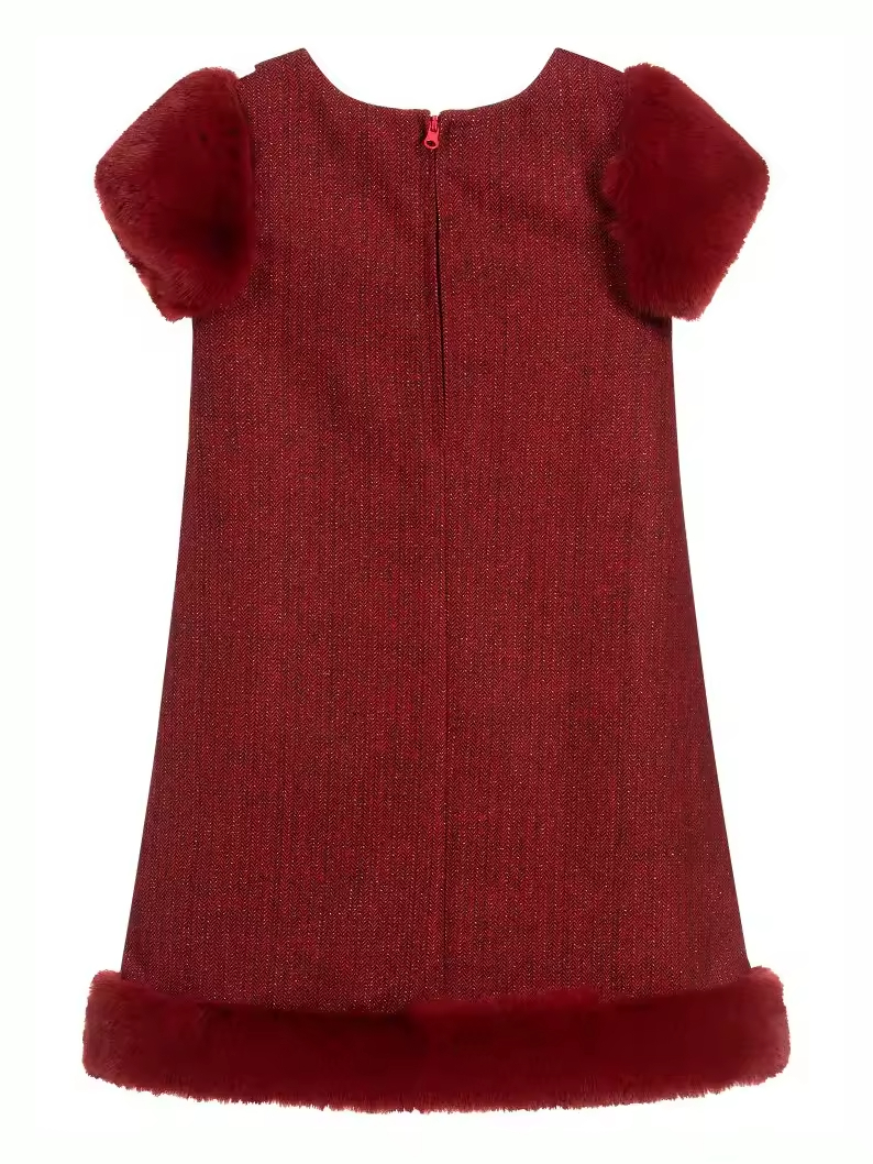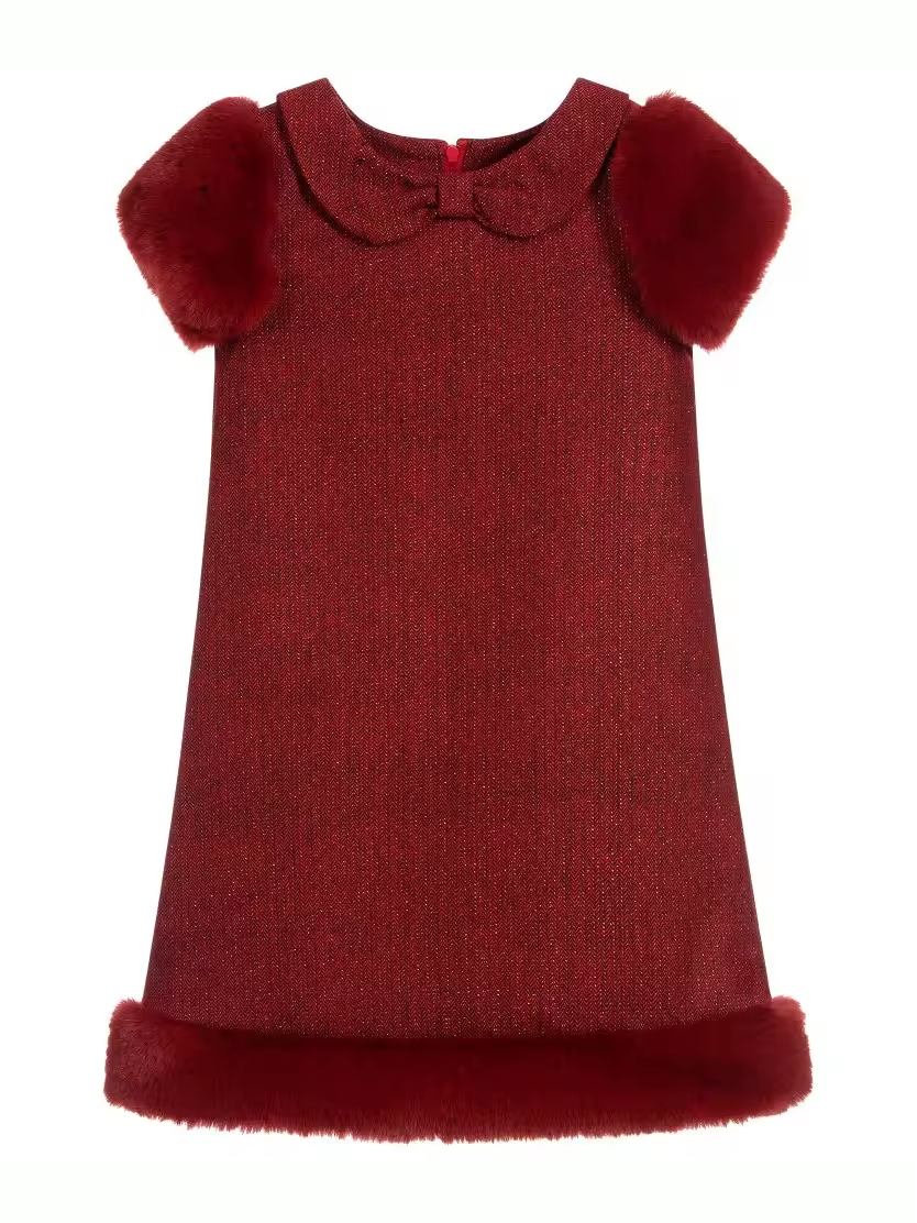Guangzhou Custom Girl Party Dress Elegant Red Dress for 10-Year-Old Little Princess Woven Solid Pattern with Faux Fur