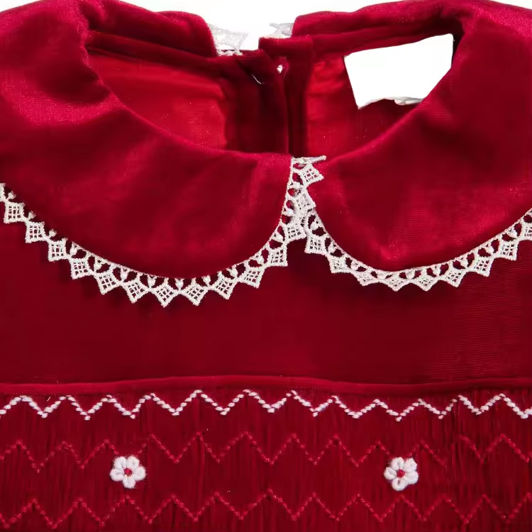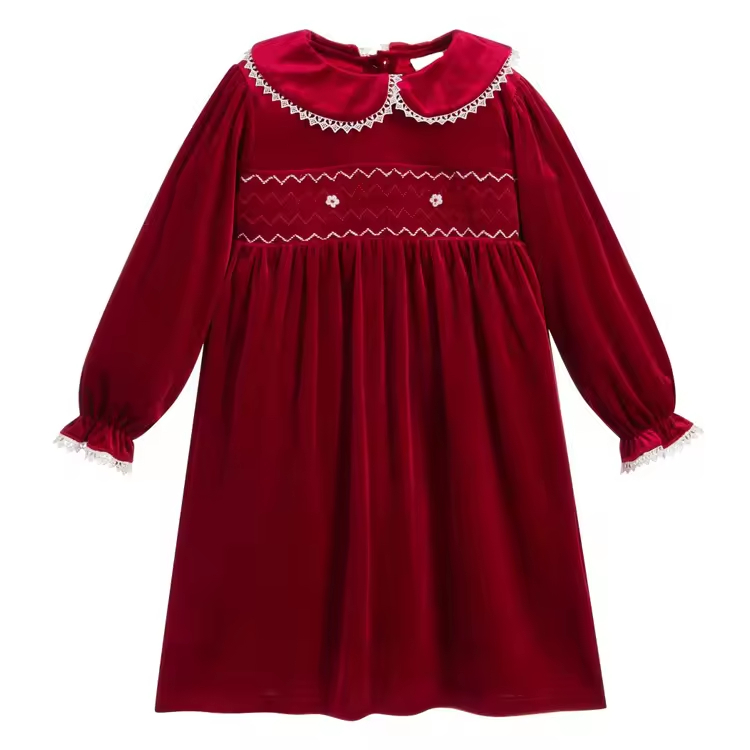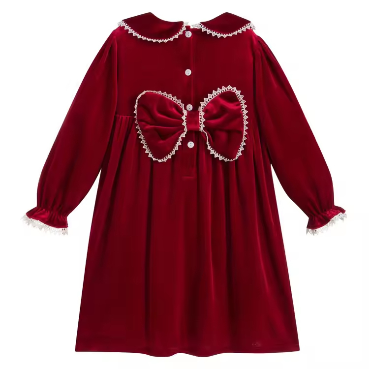 New bestseller Red Color Velvet Beautiful Evening Dresses Knee Length Lace Christmas Dress for Girl 2-10 Year New Bestseller