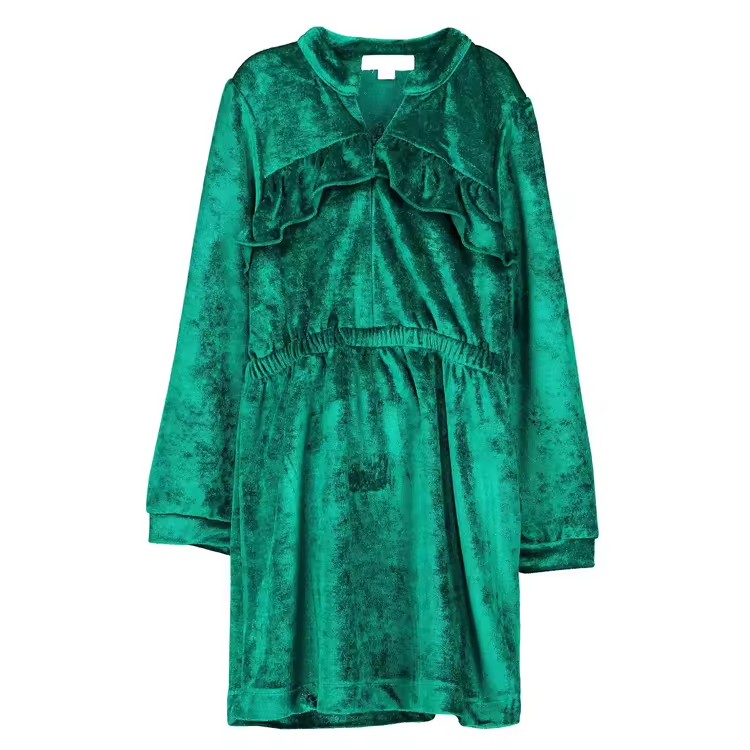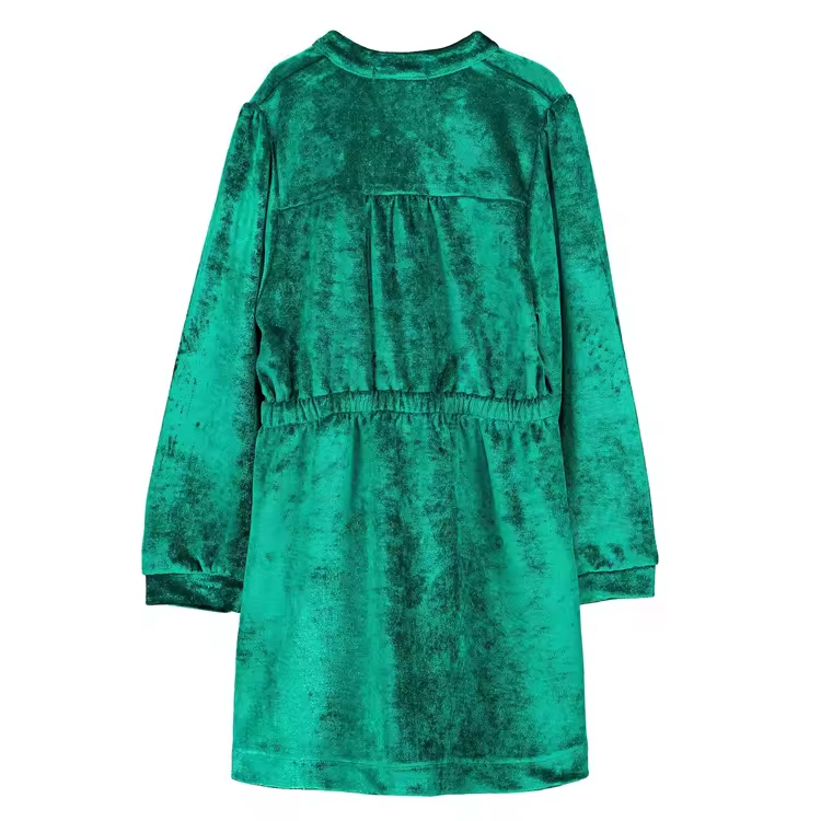 Green Elegant Velvet Dress for Girls Stylish Long Sleeve with Front Zipper Vintage Style Knee-Length for Winter