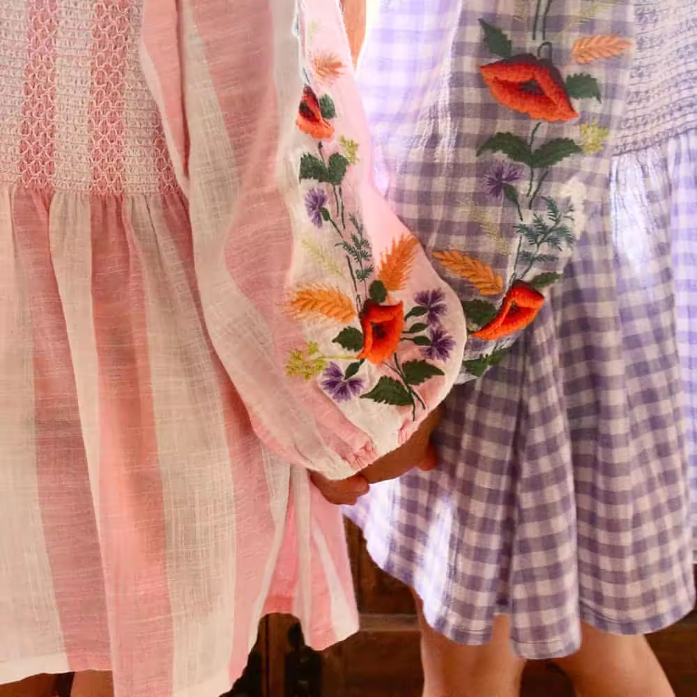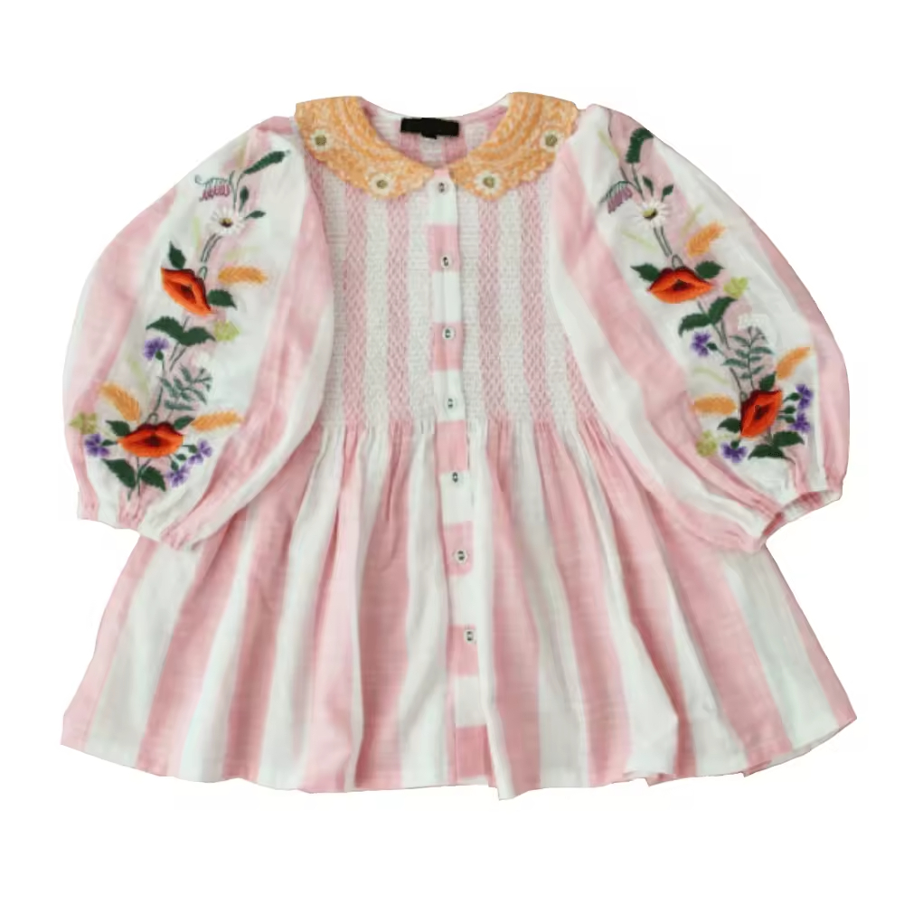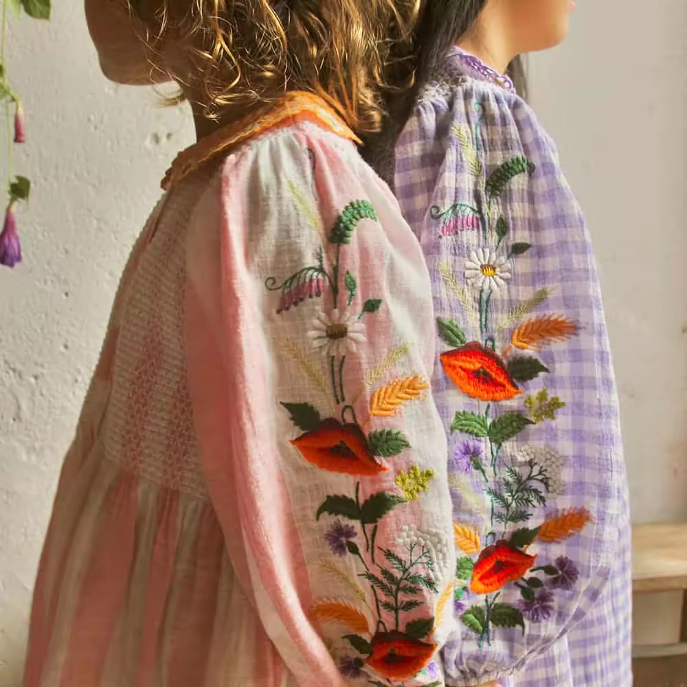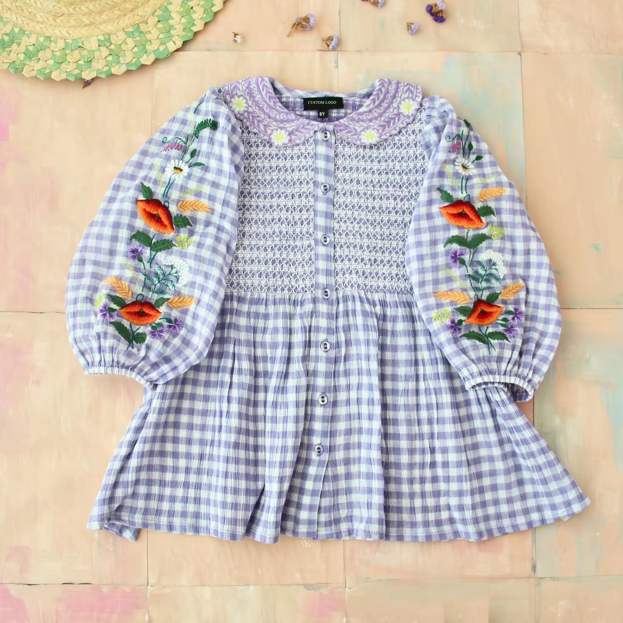 Customized Spring Cotton Plaid Toddler Girls Dresses Kids for Girls With Hand Embroidery on Sleeve Smocking Girls Dresses