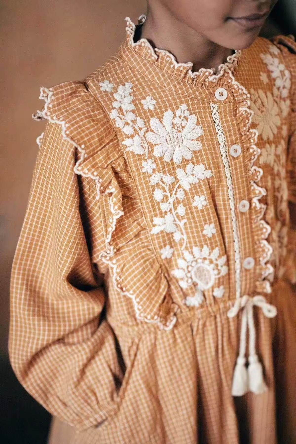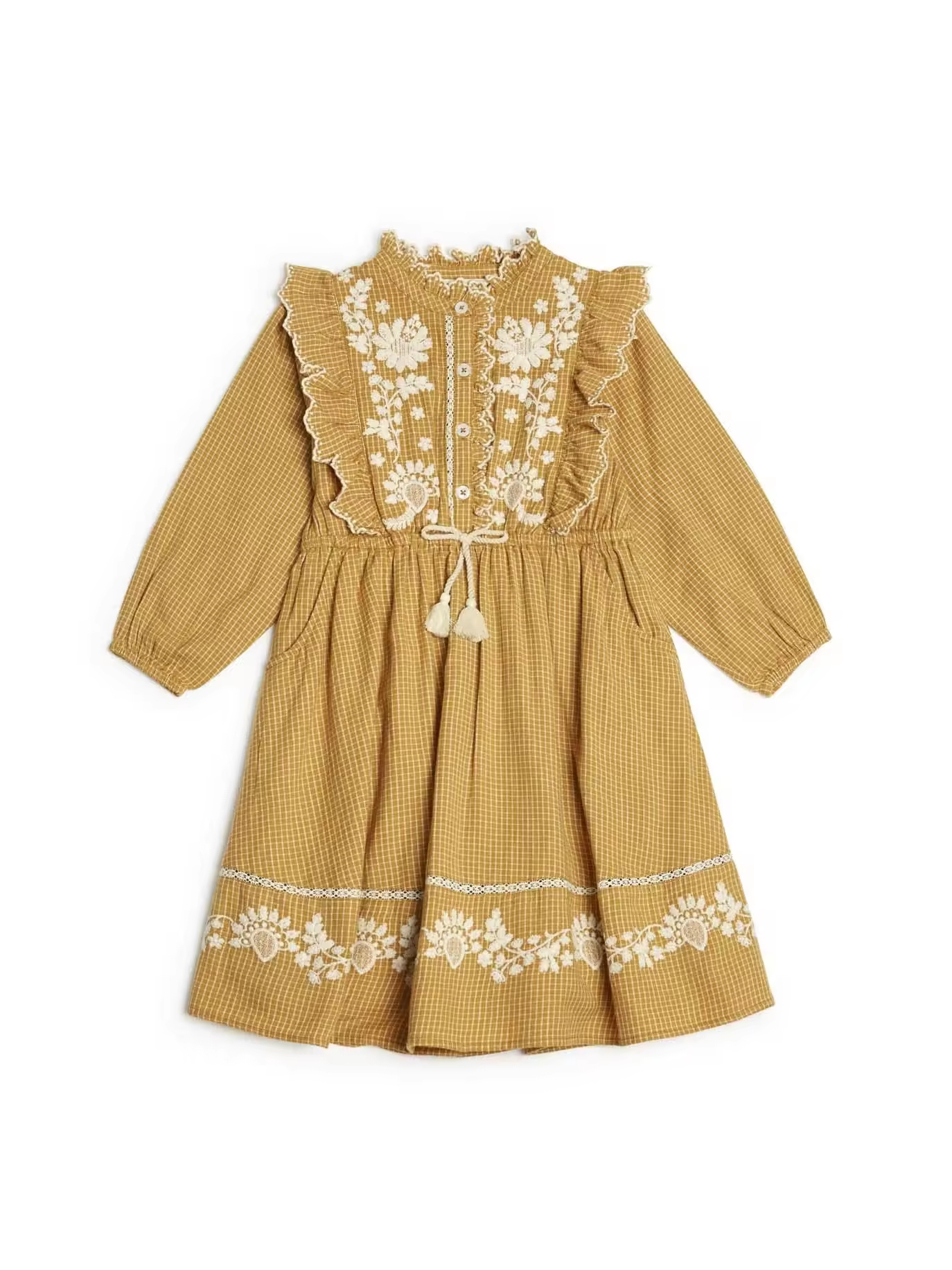 Custom Vintage Gingham Check Plaid Girls Child Dresses Kids White Embroidery Flower Cotton Linen Dresses With Ruffles
