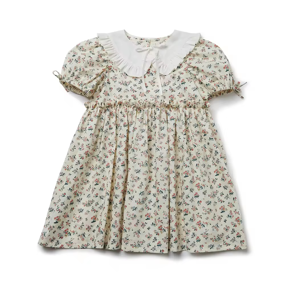 Kids Clothes Dress With Printing Lapel Collar Puff Sleeves Gathering Waist OEM By Gaoteng Manufacturer