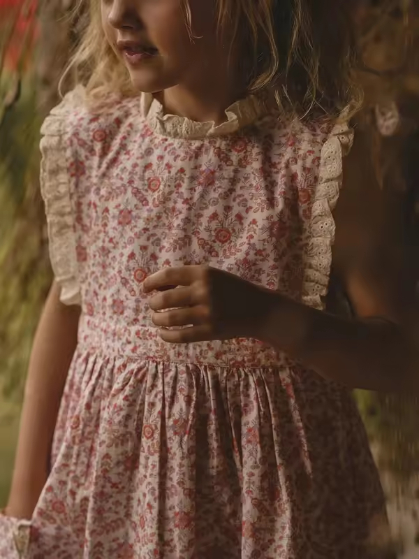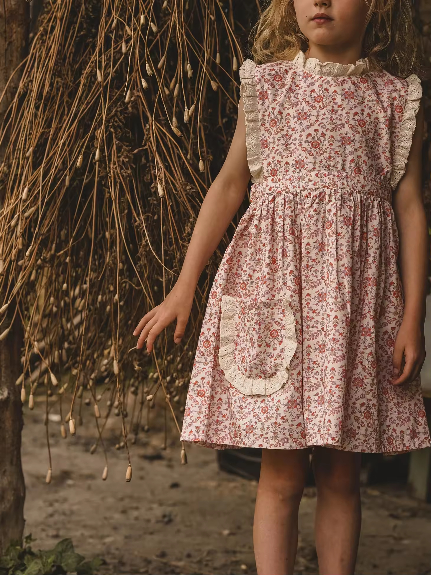 Hot Selling Vintage Beige Lace Collar Sleeveless Girls Dresses Natural Cotton Floral Dress With Pocket