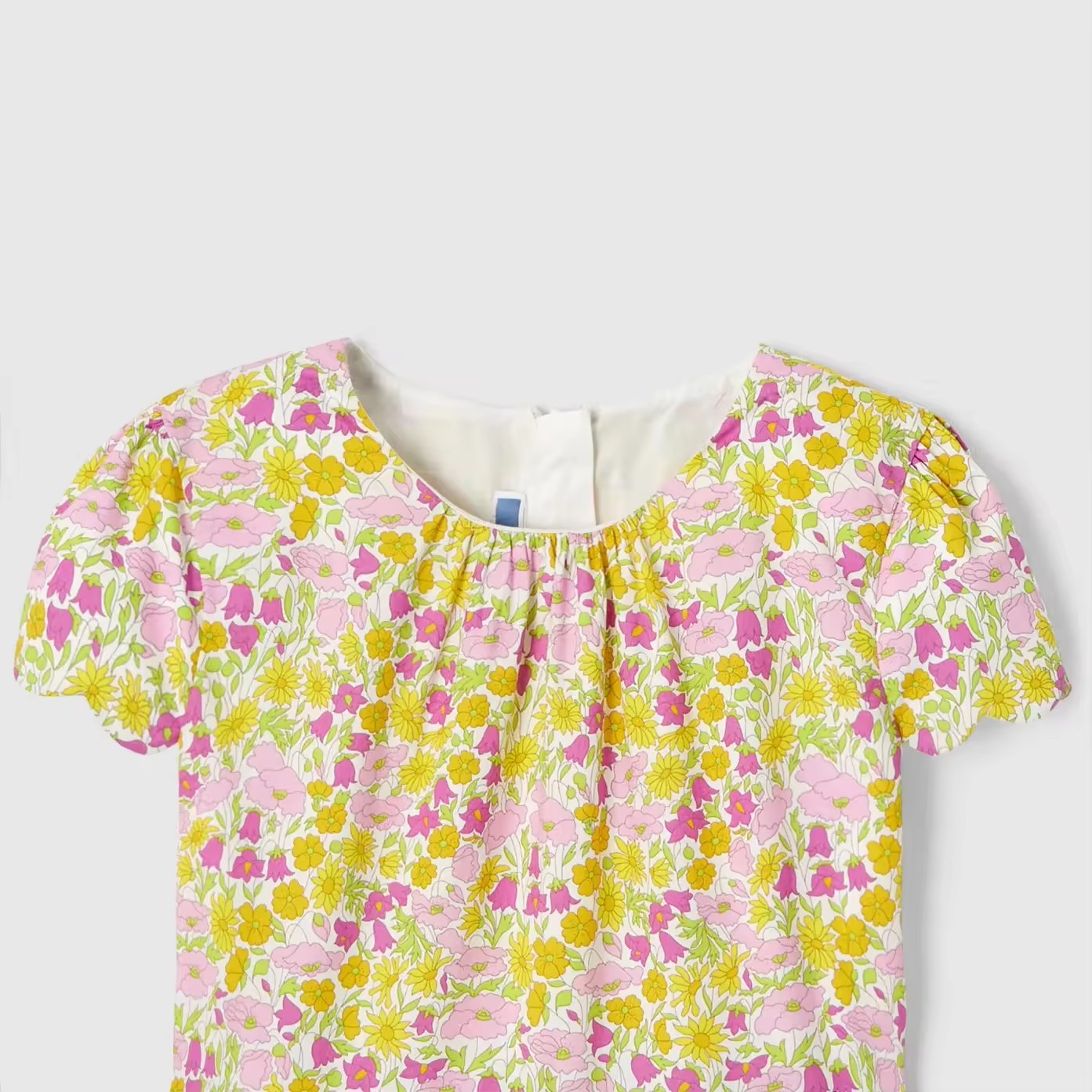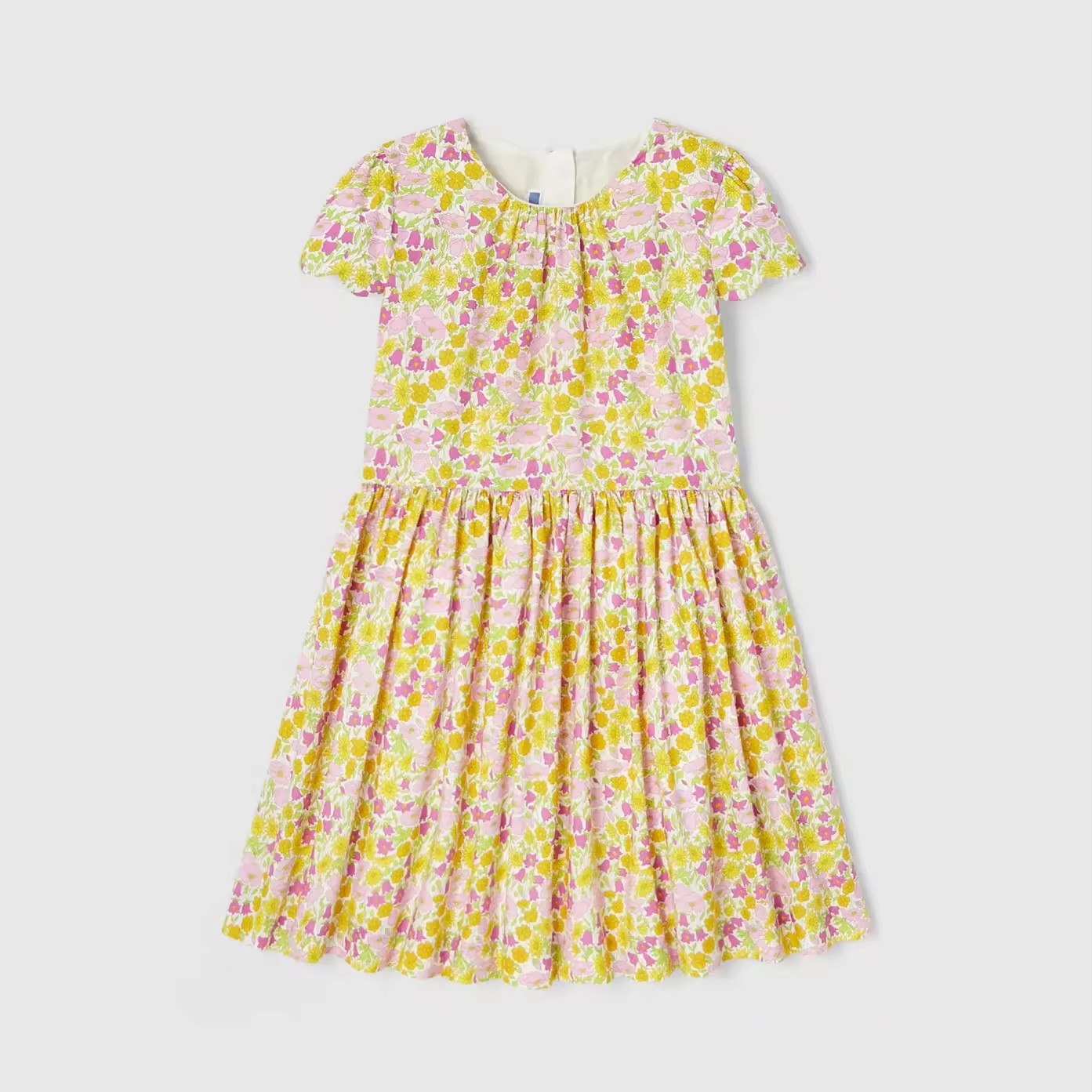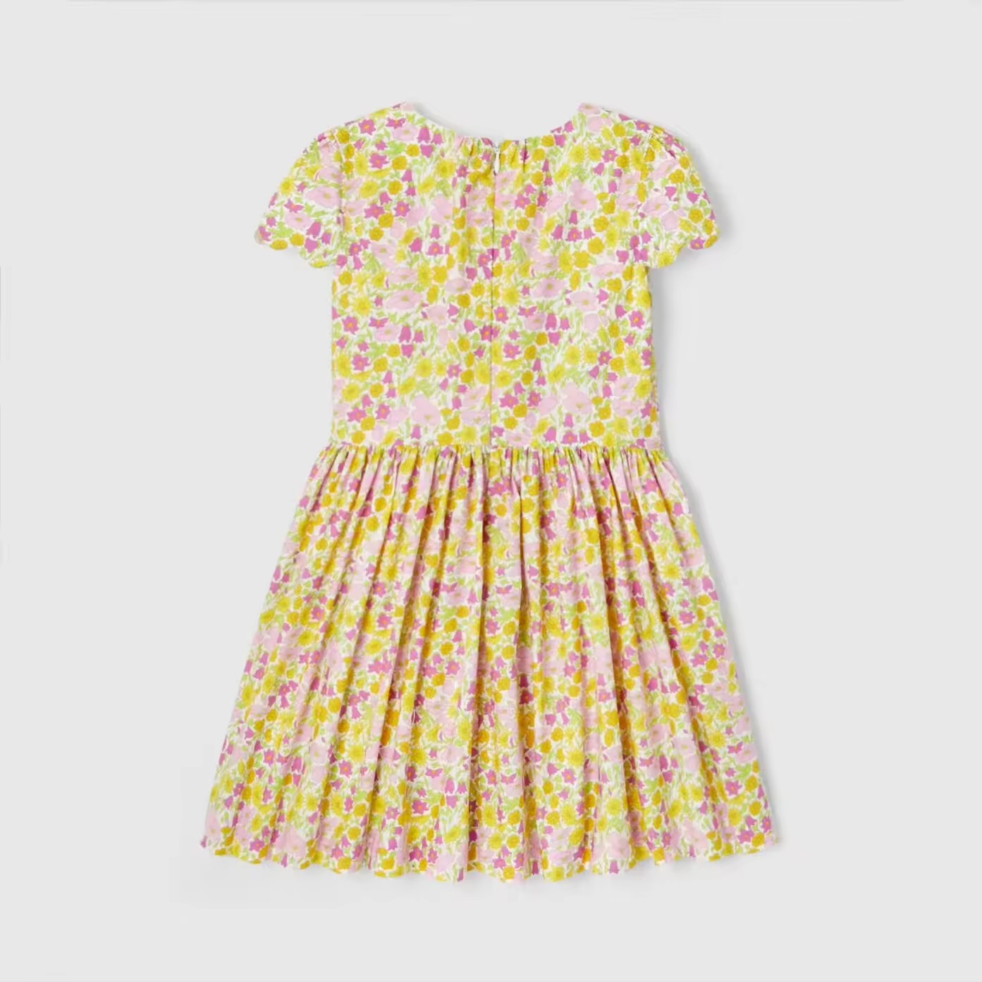 2025 Summer Floral Print Dresses for Girls OEM ODM Short Sleeve Design Woven Fabric for Children Age 1 to 12 Pleat Decoration