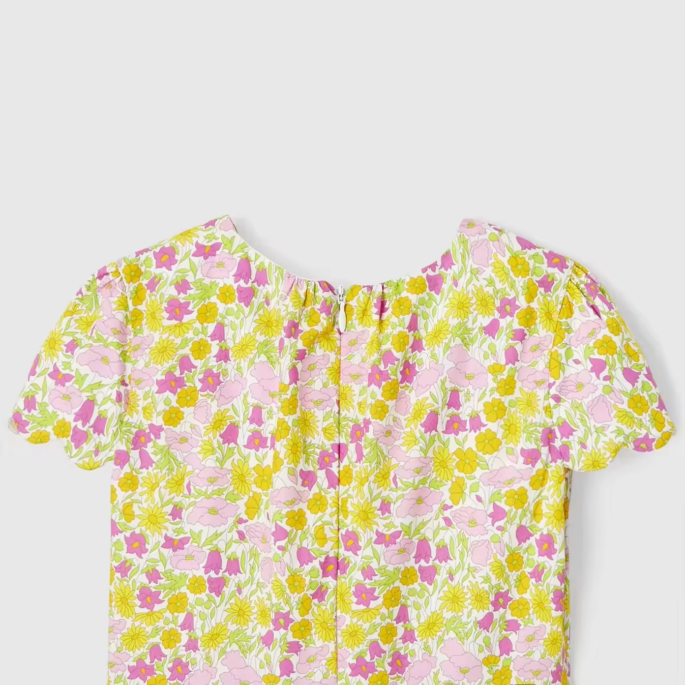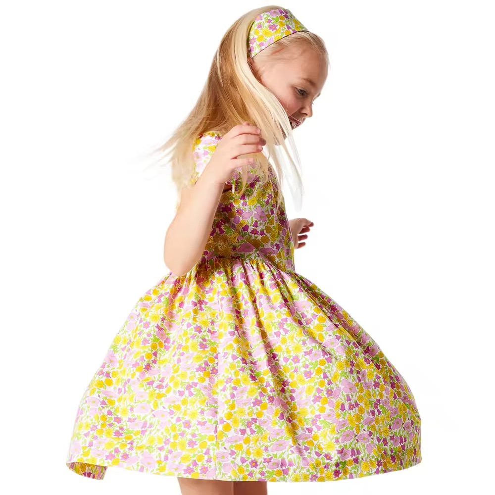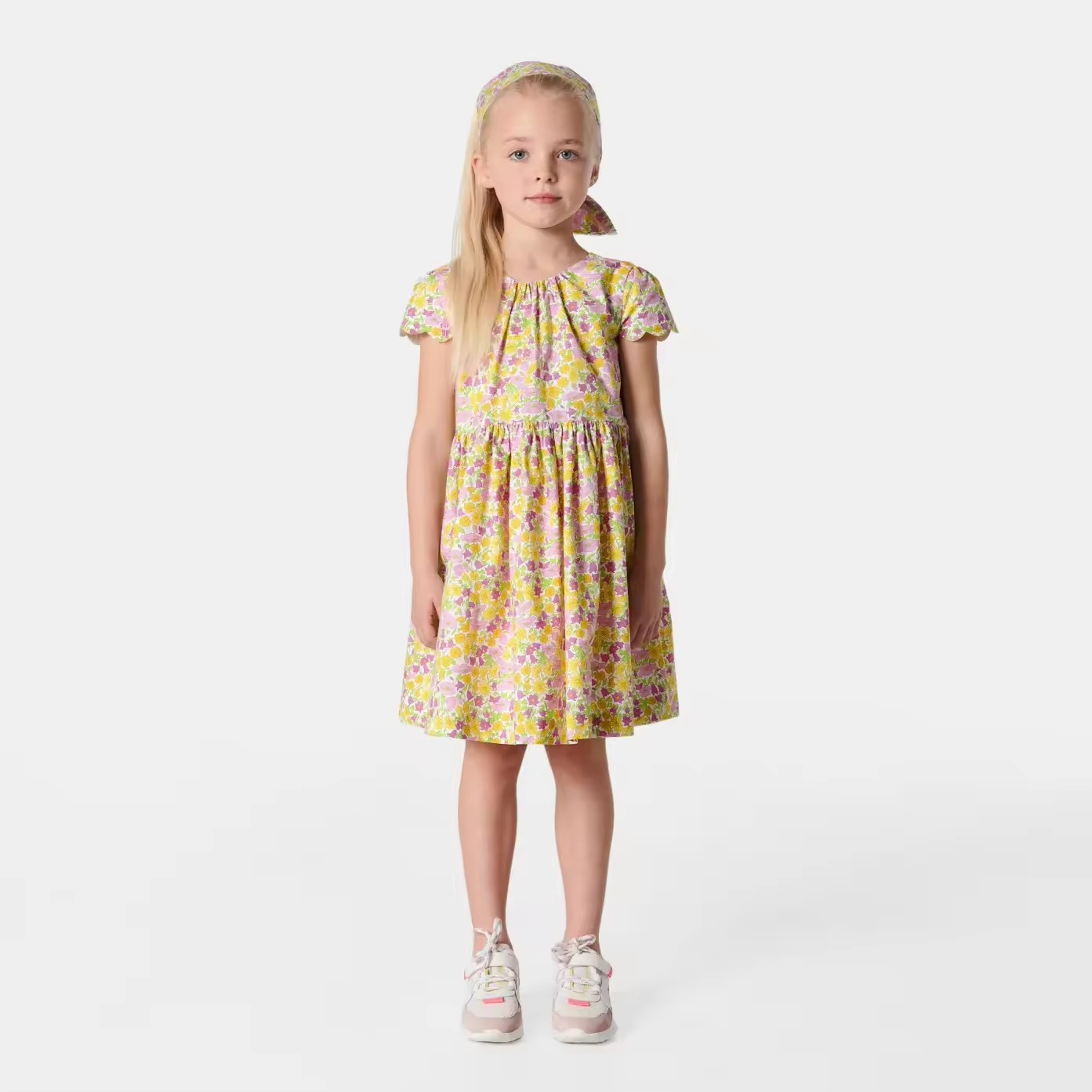2025 Summer Floral Print Dresses for Girls OEM ODM Short Sleeve Design Woven Fabric for Children Age 1 to 12 Pleat Decoration