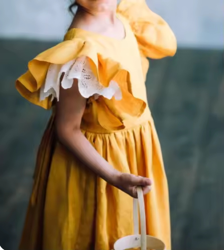 Mustard Linen Dress for Girl With Flutter Sleeve, Girls Linen Pinafore Dress, Toddler Cotton Linen Dresses