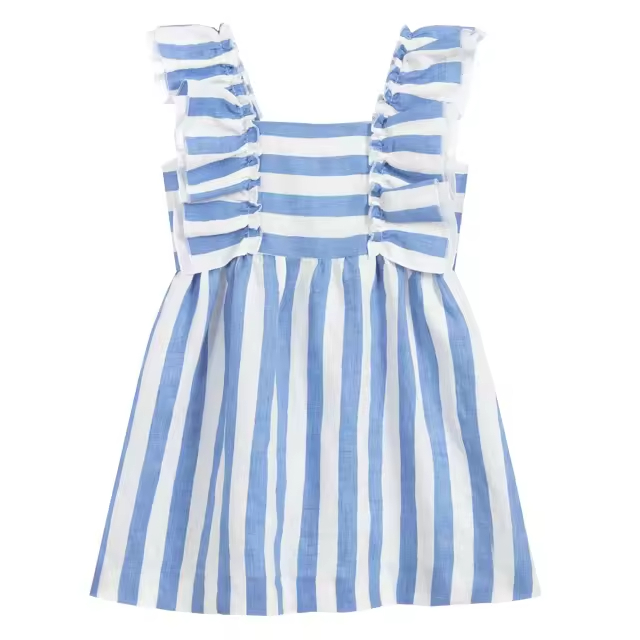 Pinafore Dress with Cotton Stripe Pattern Ruffle Strap Gathering Waist Manufacturing by Gaoteng