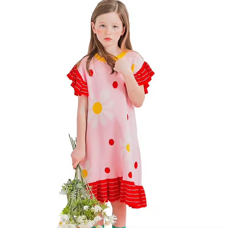 Good quality elegant summer short sleeves baby girls party dress with flowers