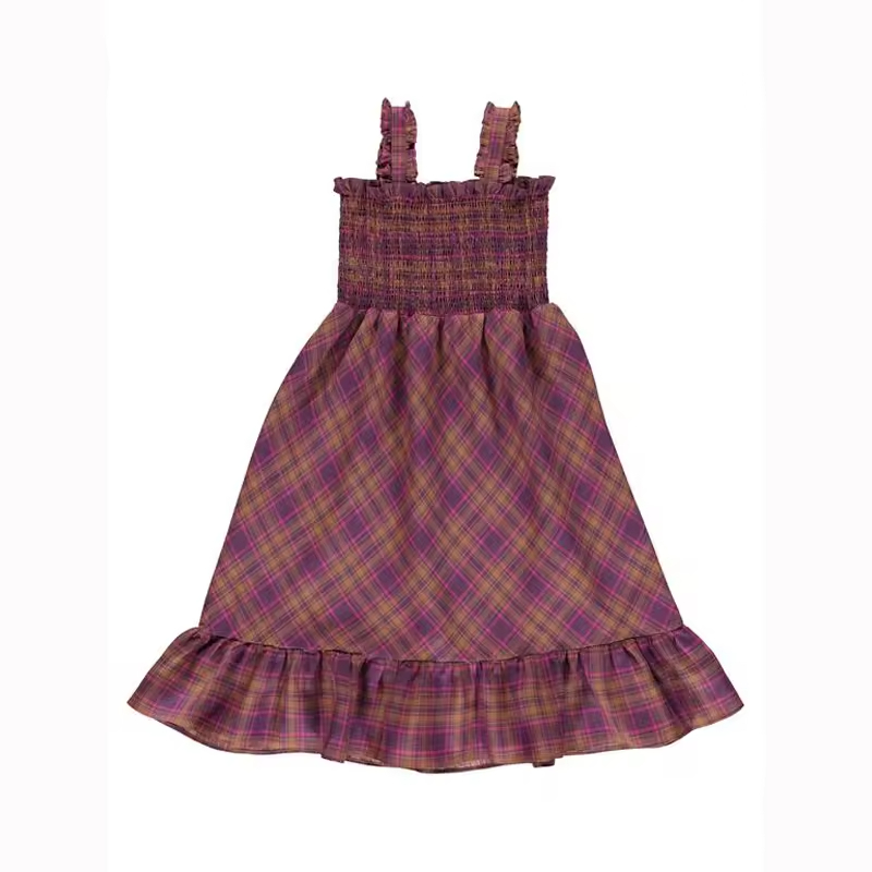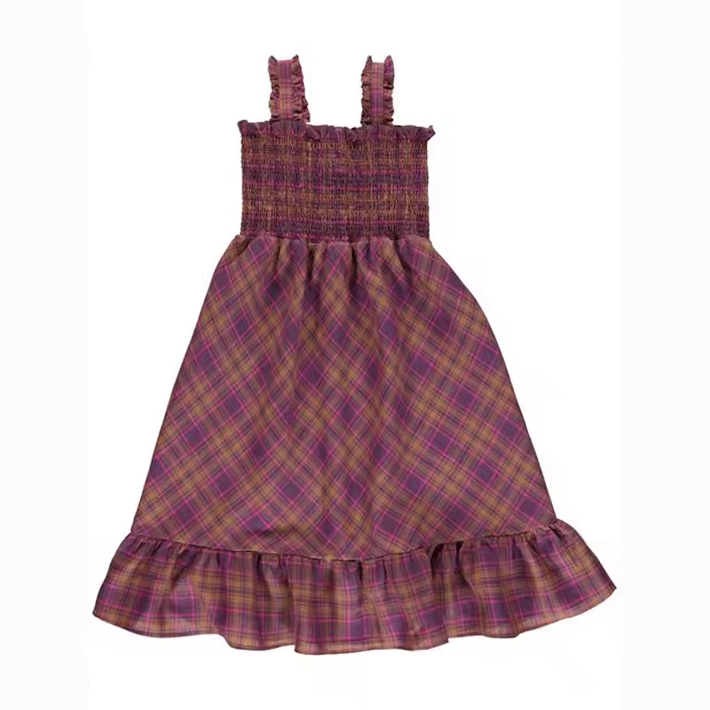 2025 Summer Fashion Girls' High Waist Robe Elegance Smocked Plaid Boho Maxi Dress Woven Fabric for Children