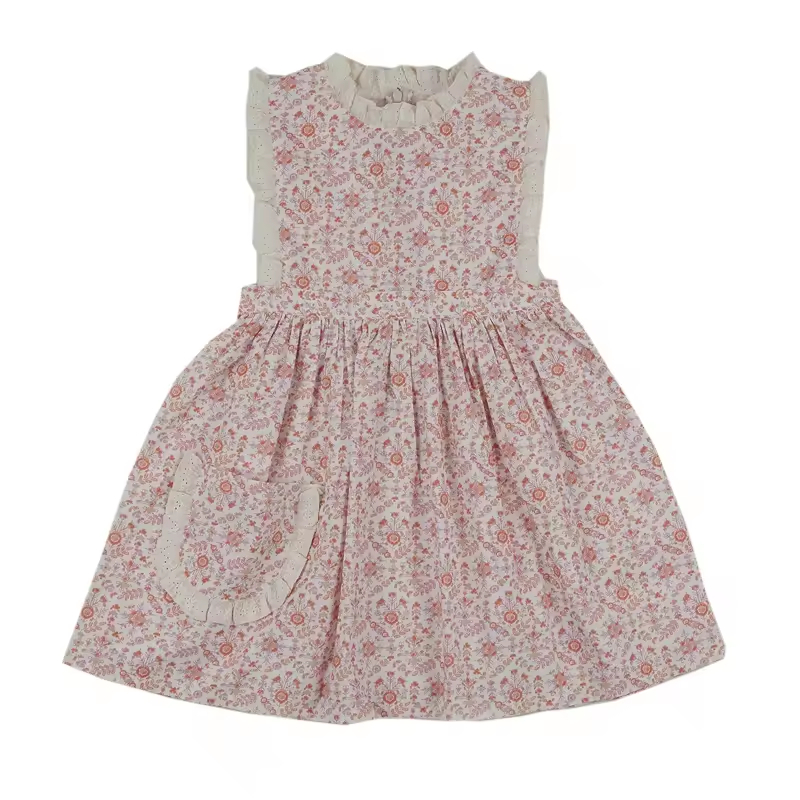 Hot Selling Vintage Beige Lace Collar Sleeveless Girls Dresses Natural Cotton Floral Dress With Pocket
