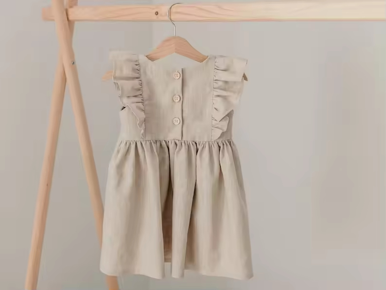 Custom Logo Made Fashion Kids Girls Dress Natural Beige Flutter Sleeves Baby Girl Linen Dress With Handmade Embroidery