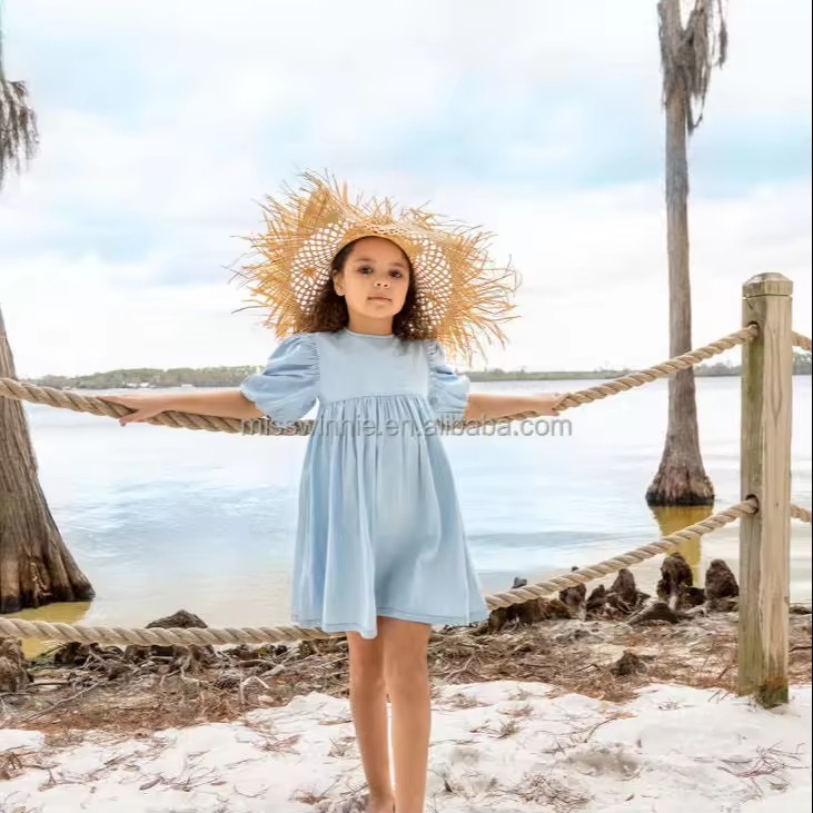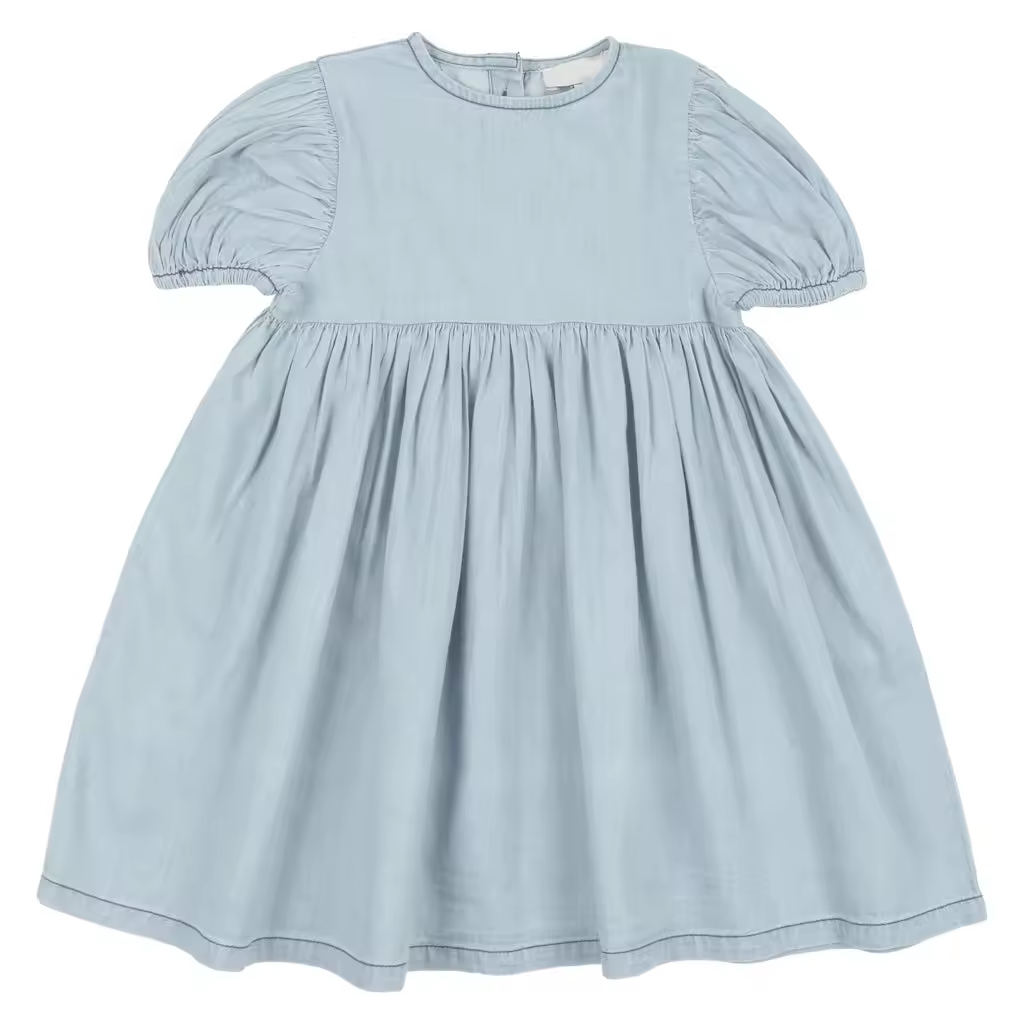 Custom Summer Light Blue Puffy Sleeve Kids Clothes Baby Cotton Jean Denim Basic Vintage Look Dress Girls Dresses for Girls