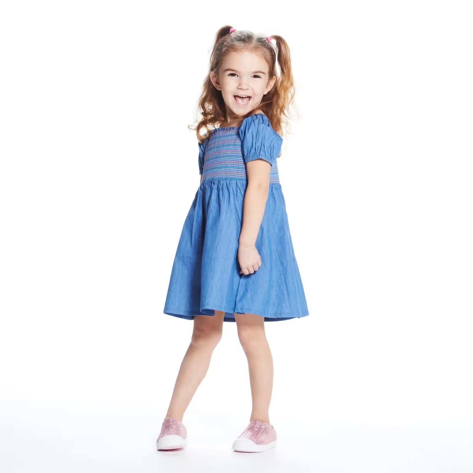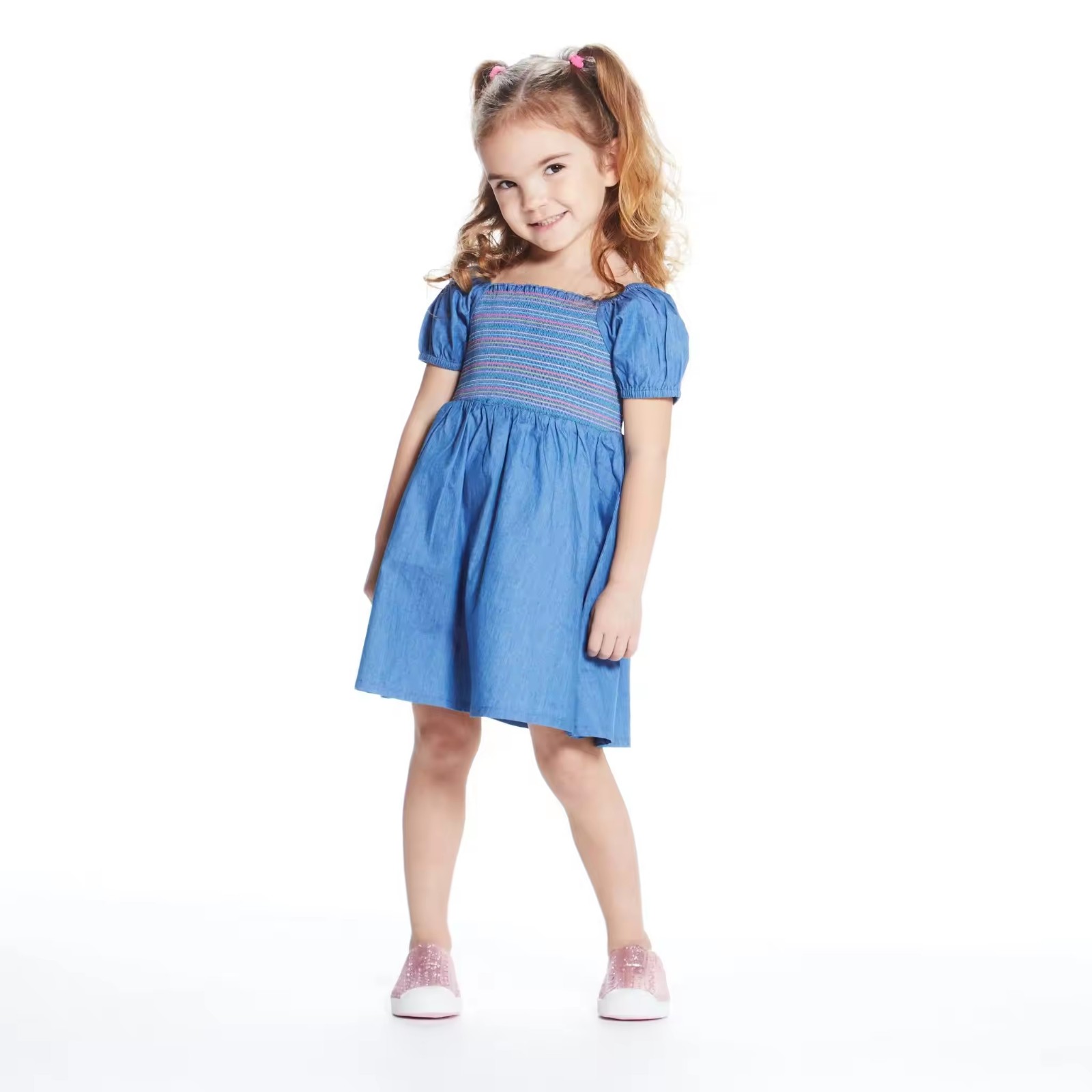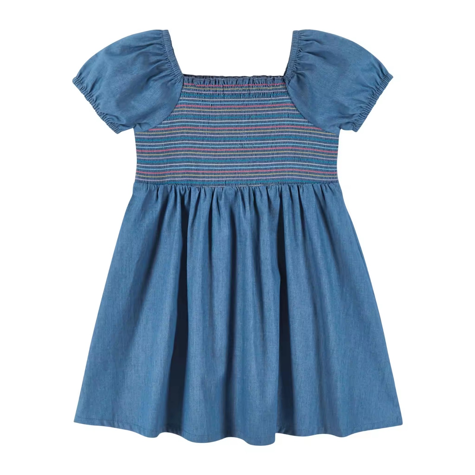 Custom Soft Denim Dress for Toddler Baby Girls Dress Summer Puffy Sleeve Girls Smocked Dresses With Colorful Threads