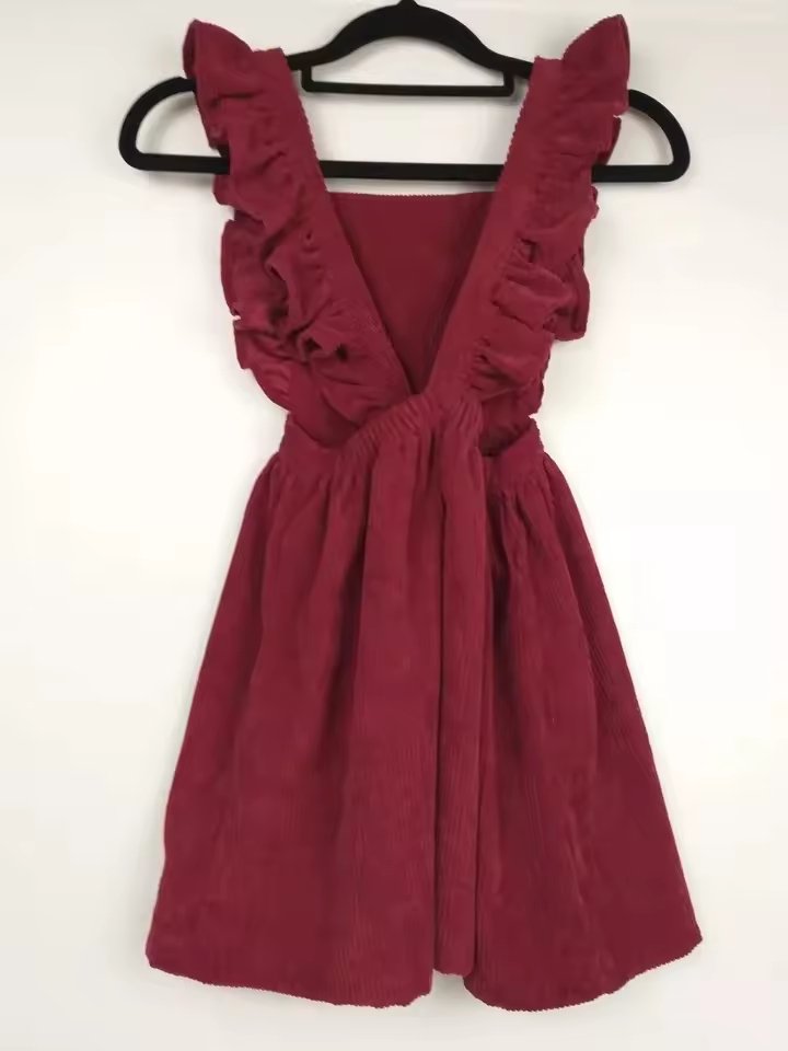 Maroon Embroidery Logo Customization Kids Girls 6-12 Years Old Corduroy Pinafore Dress Ruffle Straps Autumn Woven Print Pattern