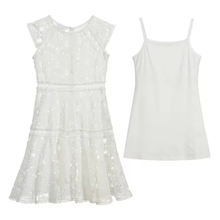 2025 OEM High End Design Floral Lace Short Sleeve Kids White Party Dresses Knee Length Cotton High Waist Summer Dress for Girl